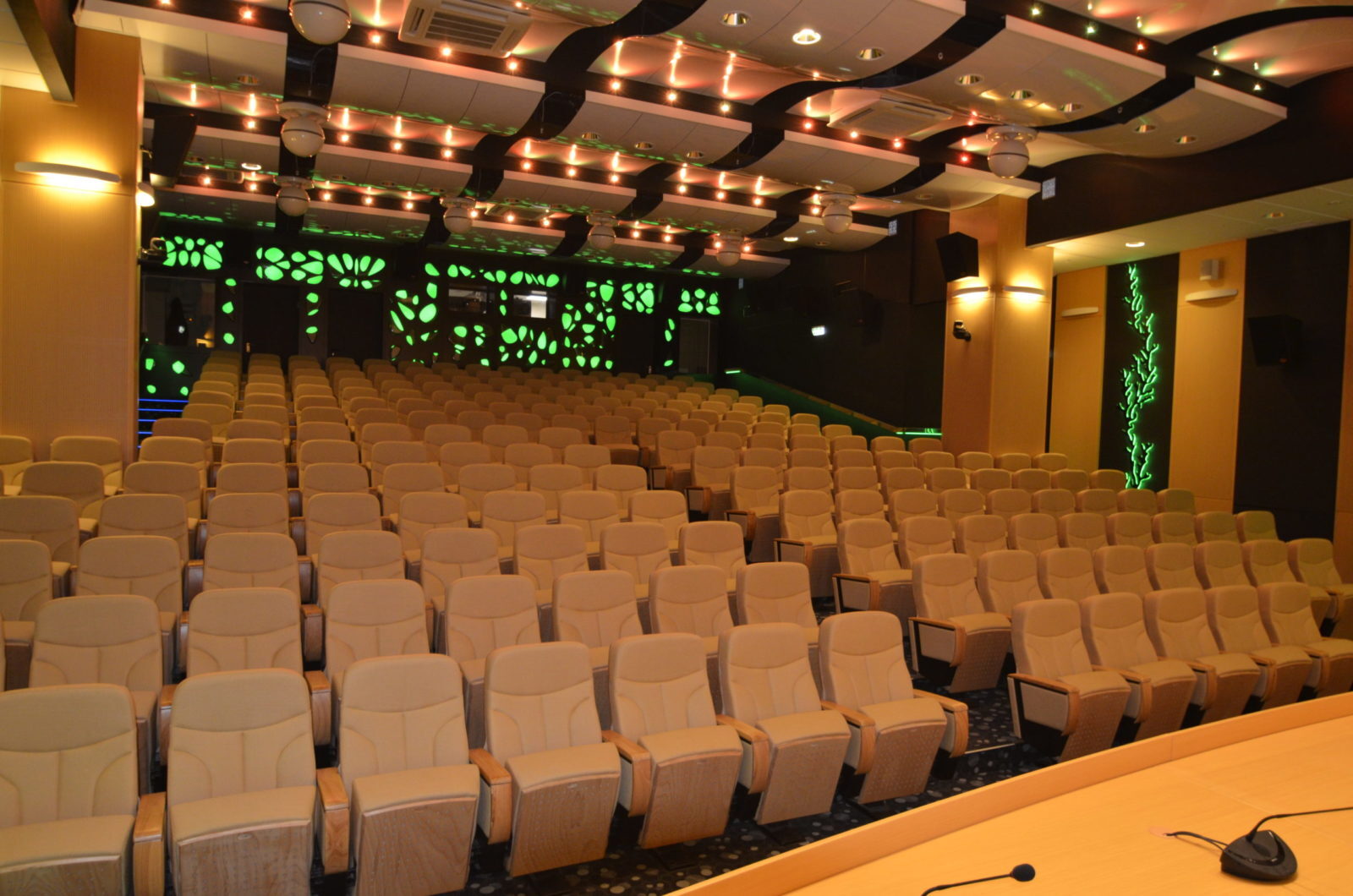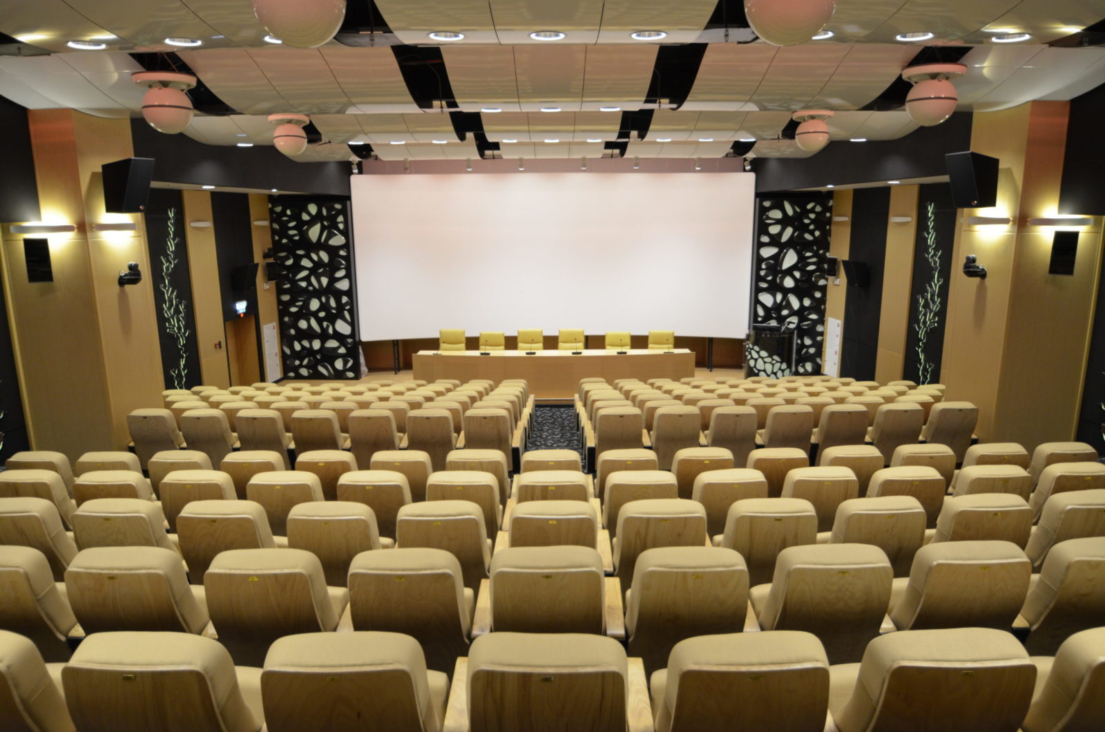 Но, помимо стендов, аквариумов и экспозиций океанариум располагает и комплексом образовательных помещений. Одним из них является конференц-зал, рассчитанный на 230 человек. Презентации и показы обучающих или документальных фильмов проводятся на 9-метровом перламутровом киноэкране Harkness Hall Perlux 180. Учитывая количество мест в зале и размеры экрана, можно смело конференц-зал называть отличным кинозалом, особенно зная следующее…